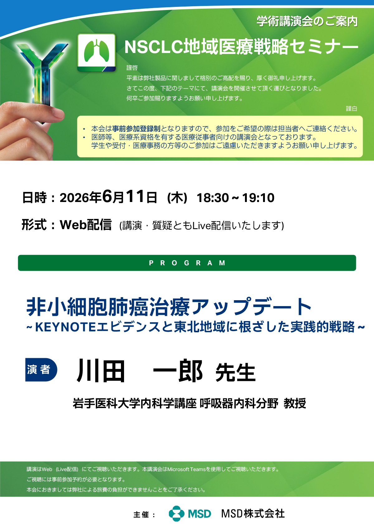 WEB講演会 NSCLC地域医療戦略セミナー 講演会に登録後、視聴サイトに遷移できない場合、ブラウザのキャッシュクリアをお試しください。キャッシュクリアの方法はこちらから確認できます。本会へご登録後、登録完 […] 演者 川田 一郎 先生 2026年06月11日 18:30 - 19:10