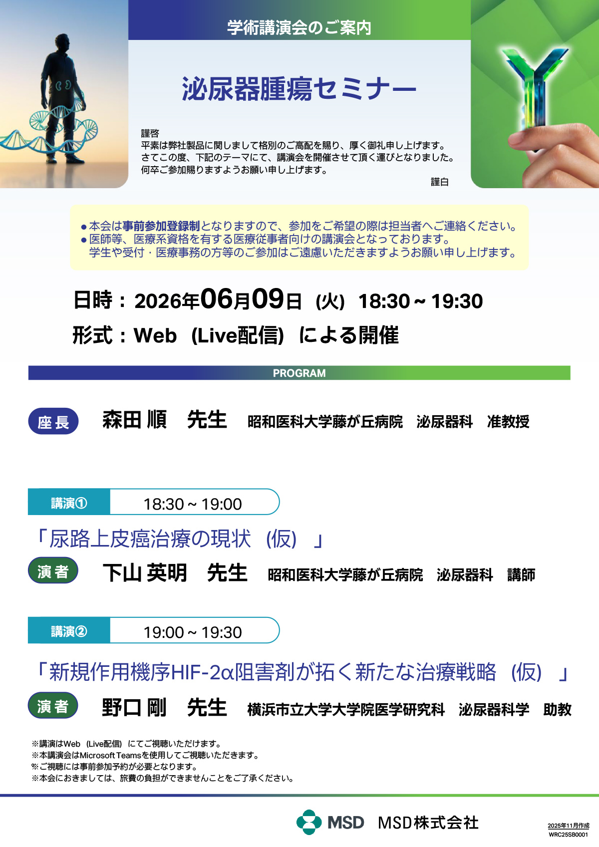 WEB講演会 泌尿器腫瘍セミナー 講演会に登録後、視聴サイトに遷移できない場合、ブラウザのキャッシュクリアをお試しください。キャッシュクリアの方法はこちらから確認できます。本会へご登録後、登録完 […] 演者 森田 順 先生, 下山 英明 先生, 野口 剛 先生 2026年06月09日 18:30 - 19:30