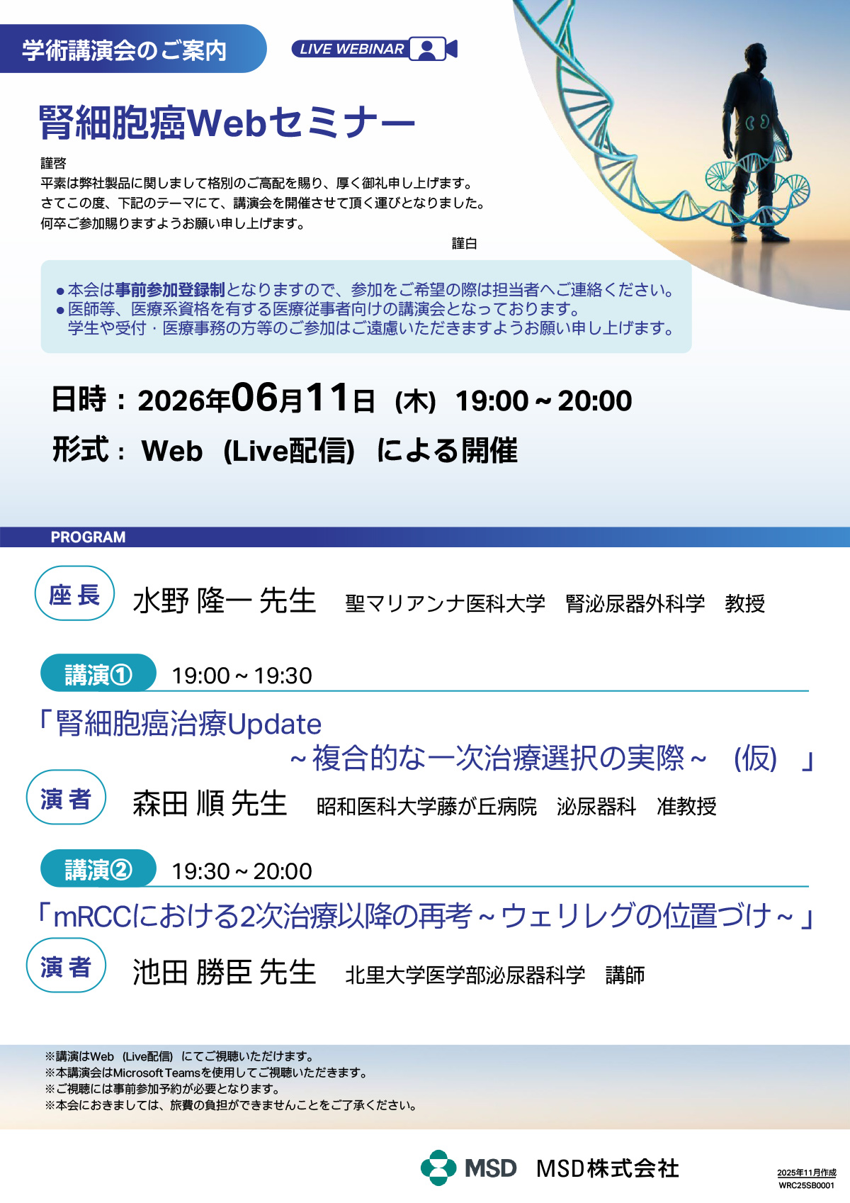 WEB講演会 腎細胞癌Webセミナー 講演会に登録後、視聴サイトに遷移できない場合、ブラウザのキャッシュクリアをお試しください。キャッシュクリアの方法はこちらから確認できます。本会へご登録後、登録完 […] 演者 水野 隆一 先生, 池田 勝臣 先生, 森田 順 先生 2026年06月11日 19:00 - 20:00