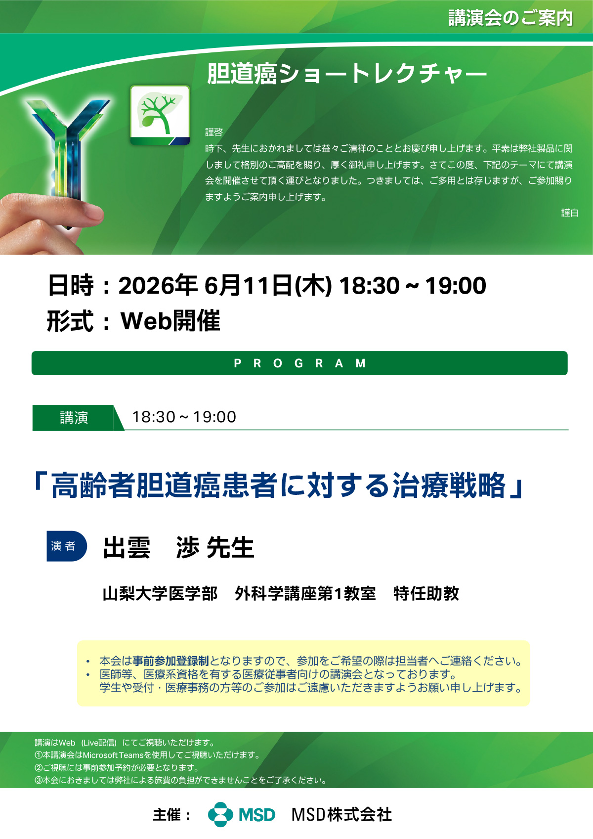 WEB講演会 胆道癌ショートレクチャー 講演会に登録後、視聴サイトに遷移できない場合、ブラウザのキャッシュクリアをお試しください。キャッシュクリアの方法はこちらから確認できます。本会へご登録後、登録完 […] 演者 出雲 渉 先生 2026年06月11日 18:30 - 19:00