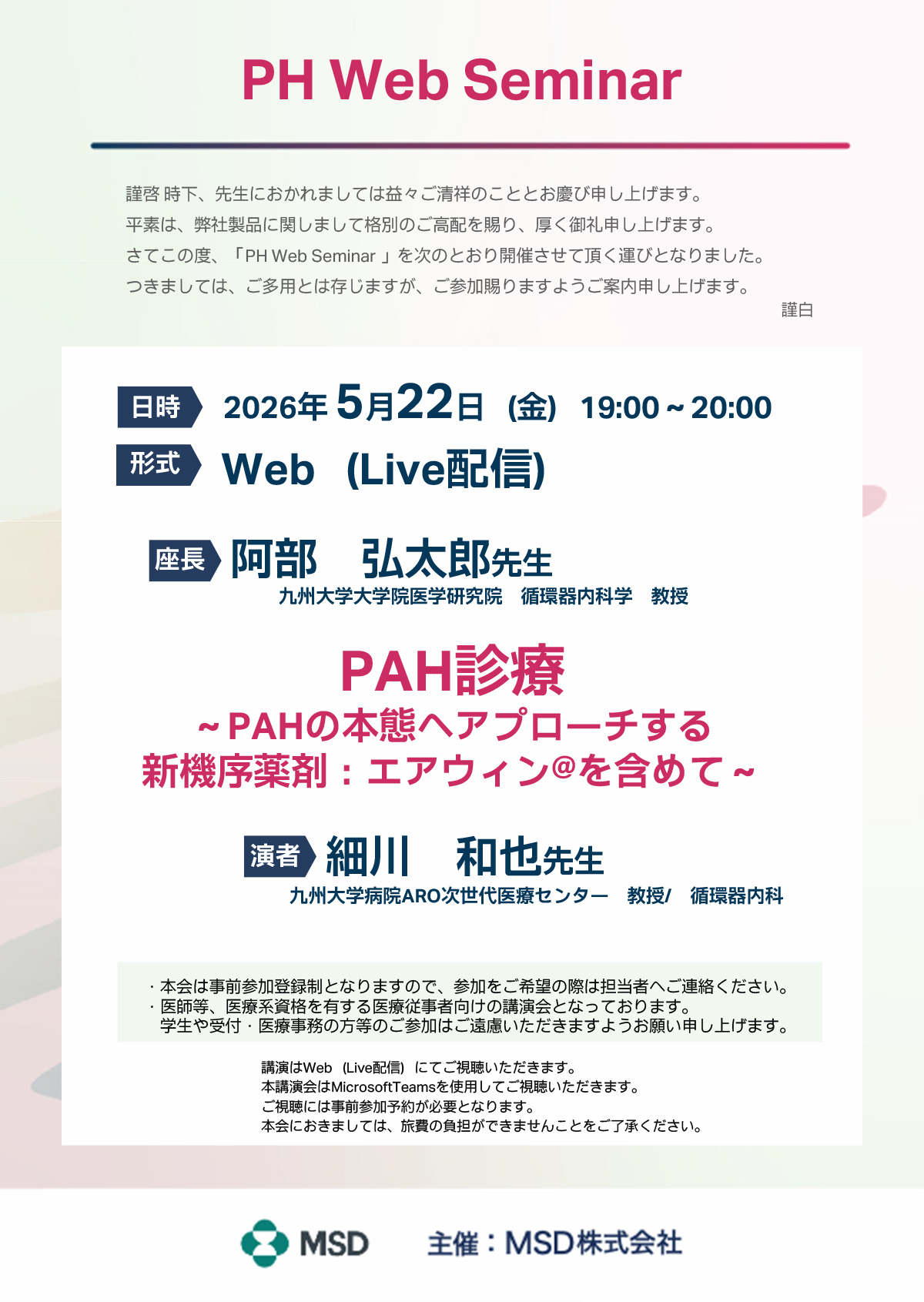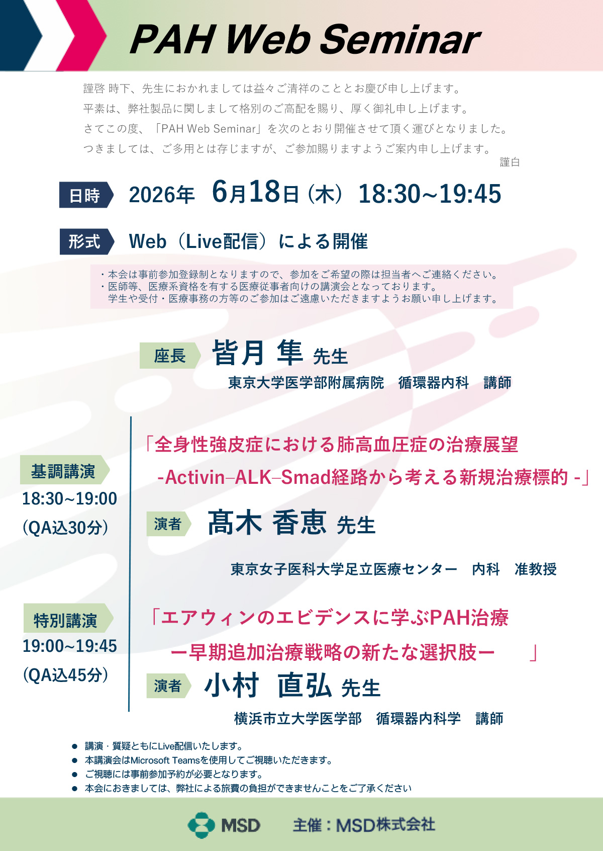 WEB講演会 PAH Web Seminar 講演会に登録後、視聴サイトに遷移できない場合、ブラウザのキャッシュクリアをお試しください。キャッシュクリアの方法はこちらから確認できます。本会へご登録後、登録完 […] 演者 小村 直弘 先生, 髙木 香恵 先生, 皆月 隼 先生 2026年06月18日 18:30 - 19:45