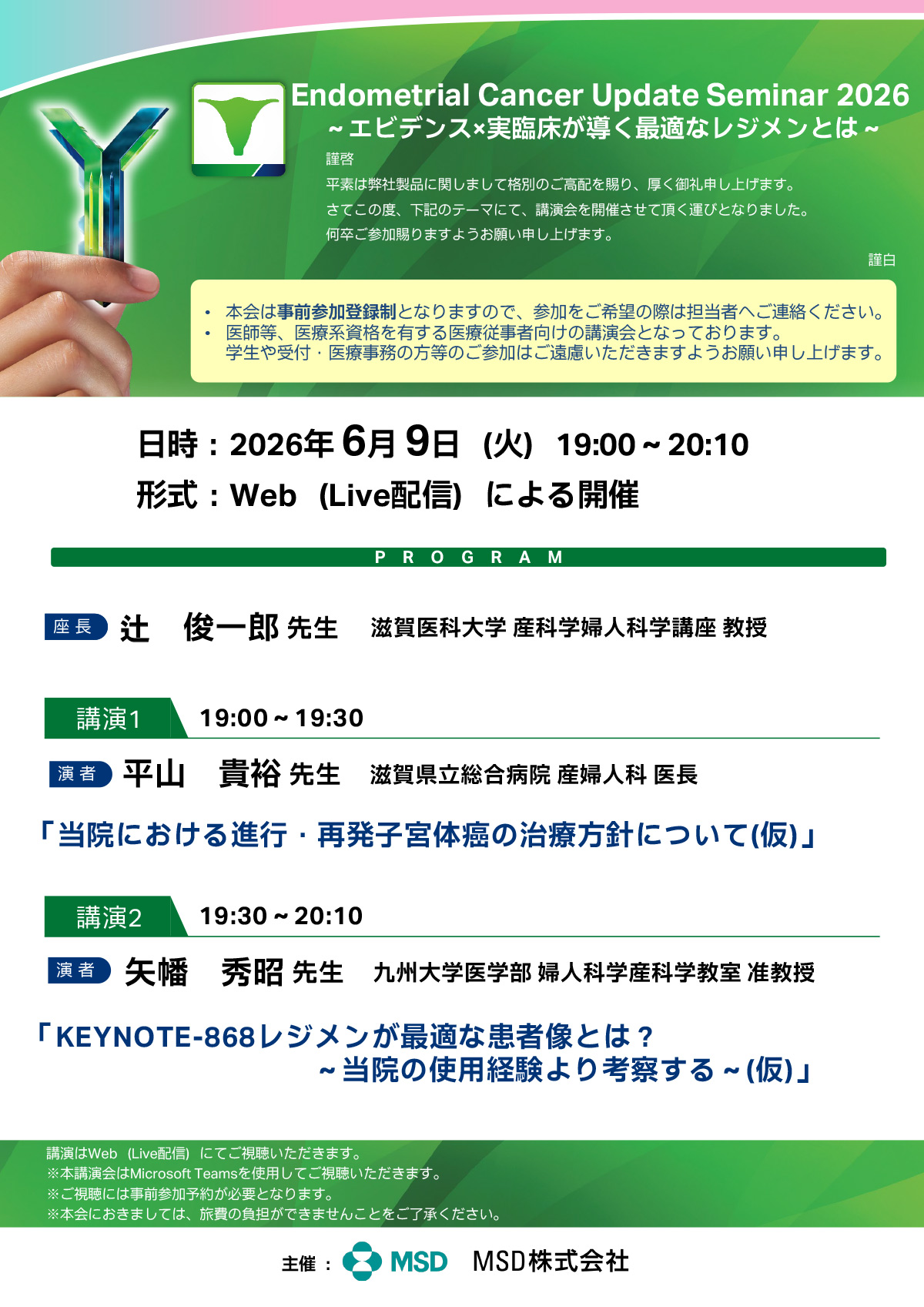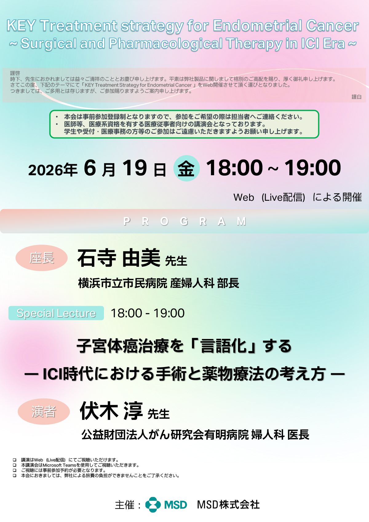 WEB講演会 Endometrial Cancer Update Seminar 2026 ~エビデンス×実臨床が導く最適なレジメンとは~ 講演会に登録後、視聴サイトに遷移できない場合、ブラウザのキャッシュクリアをお試しください。キャッシュクリアの方法はこちらから確認できます。本会へご登録後、登録完 […] 演者 平山 貴裕 先生, 矢幡 秀昭 先生, 辻 俊一郎 先生 2026年06月09日 19:00 - 20:10