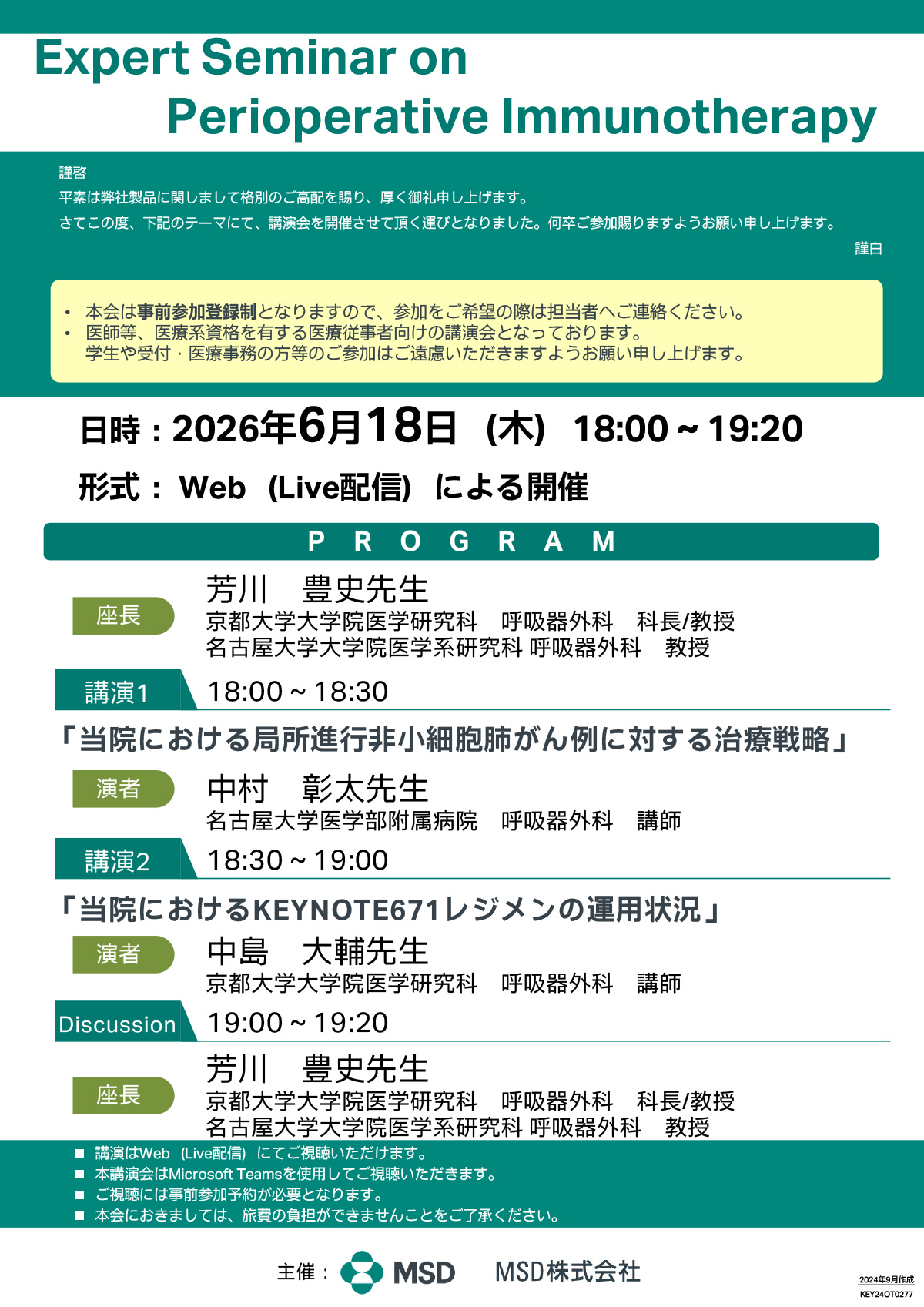 WEB講演会 Expert Seminar on Perioperative Immunotherapy 講演会に登録後、視聴サイトに遷移できない場合、ブラウザのキャッシュクリアをお試しください。キャッシュクリアの方法はこちらから確認できます。本会へご登録後、登録完 […] 演者 芳川 豊史 先生, 中村 彰太 先生, 中島 大輔 先生 2026年06月18日 18:00 - 19:20