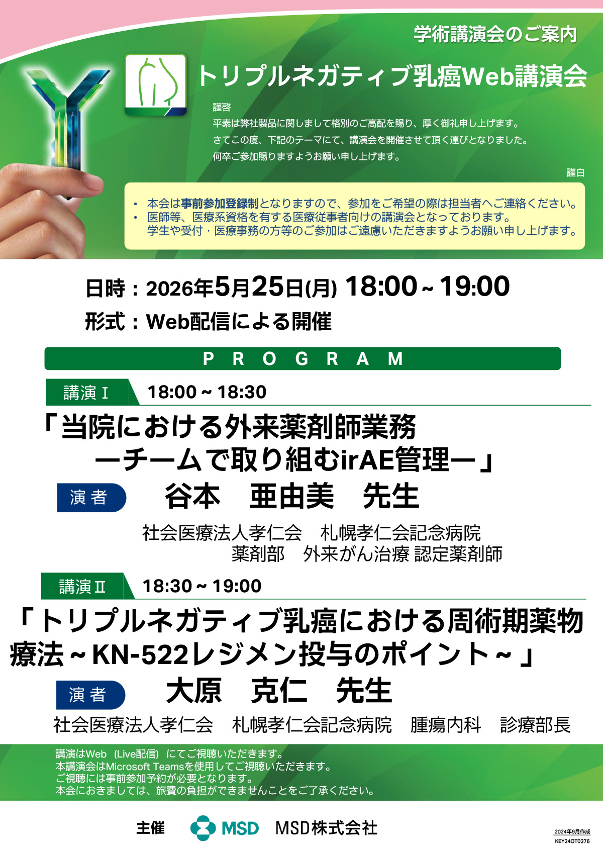 WEB講演会 トリプルネガティブ乳癌Web講演会 講演会に登録後、視聴サイトに遷移できない場合、ブラウザのキャッシュクリアをお試しください。キャッシュクリアの方法はこちらから確認できます。本会へご登録後、登録完 […] 演者 谷本 亜由美 先生, 大原 克仁 先生 2026年05月25日 18:00 - 19:00