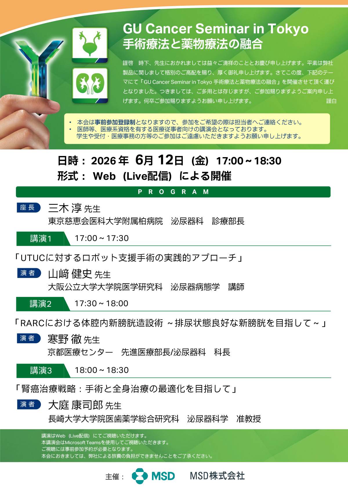 WEB講演会 GU Cancer Seminar in Tokyo 手術療法と薬物療法の融合 講演会に登録後、視聴サイトに遷移できない場合、ブラウザのキャッシュクリアをお試しください。キャッシュクリアの方法はこちらから確認できます。本会へご登録後、登録完 […] 演者 三木 淳 先生, 山﨑 健史 先生, 寒野 徹 先生, 大庭 康司郎 先生 2026年06月12日 17:00 - 18:30