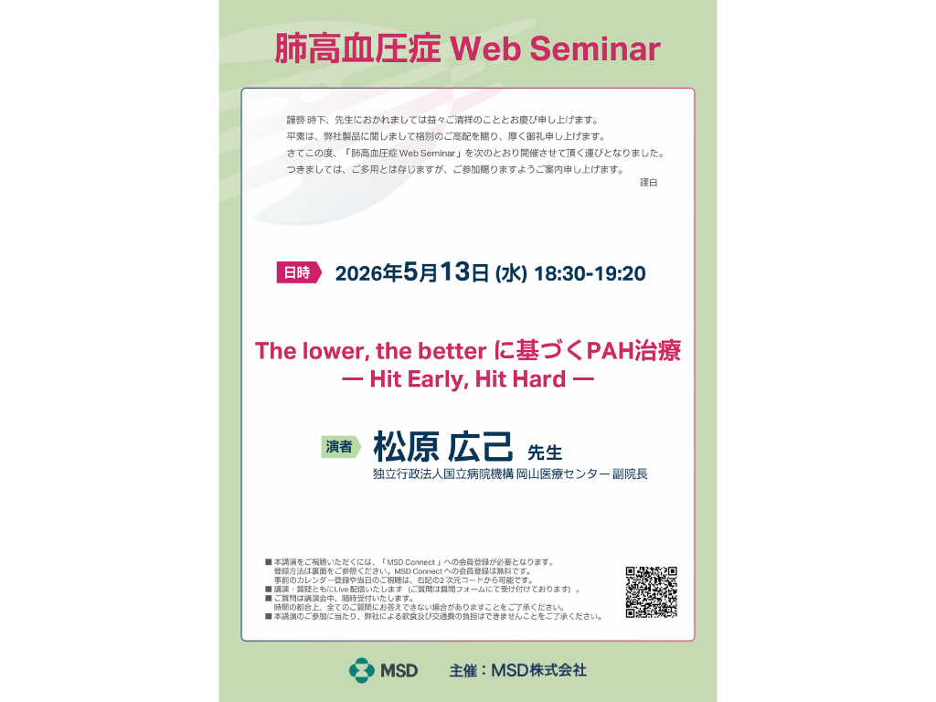 本動画では、PAH診断後1年未満の中リスク又は高リスク患者を対象とした海外第Ⅲ相臨床試験 HYPERION試験の結果について、産業医科大学 医学部 第2内科学 […]