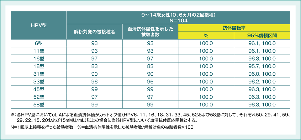 本試験は、9~15歳の日本人健康男女を対象とした試験ですが、9~14歳女性のシルガード®9の2回接種の結果について記載しています。