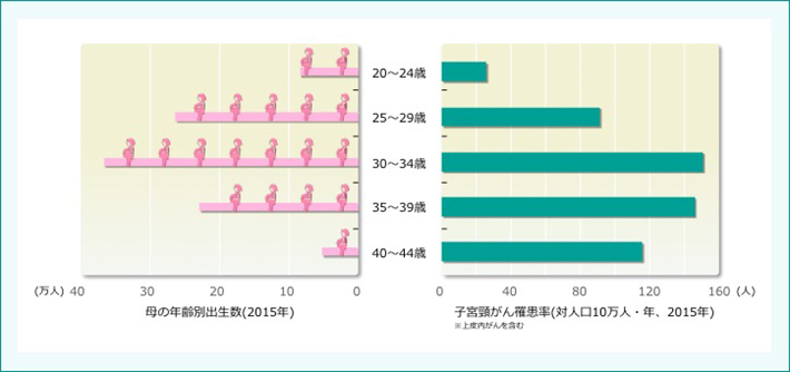 子宮頸がんの罹患率は20歳代後半から徐々に増えていきます。20~30歳代は、女性が出産を迎える世代でもあります(図3)。女性の出産年齢と子宮頸がんの罹患年齢が重なっていることから、子宮頸がんは別名「マザーキラー」とも呼ばれています。