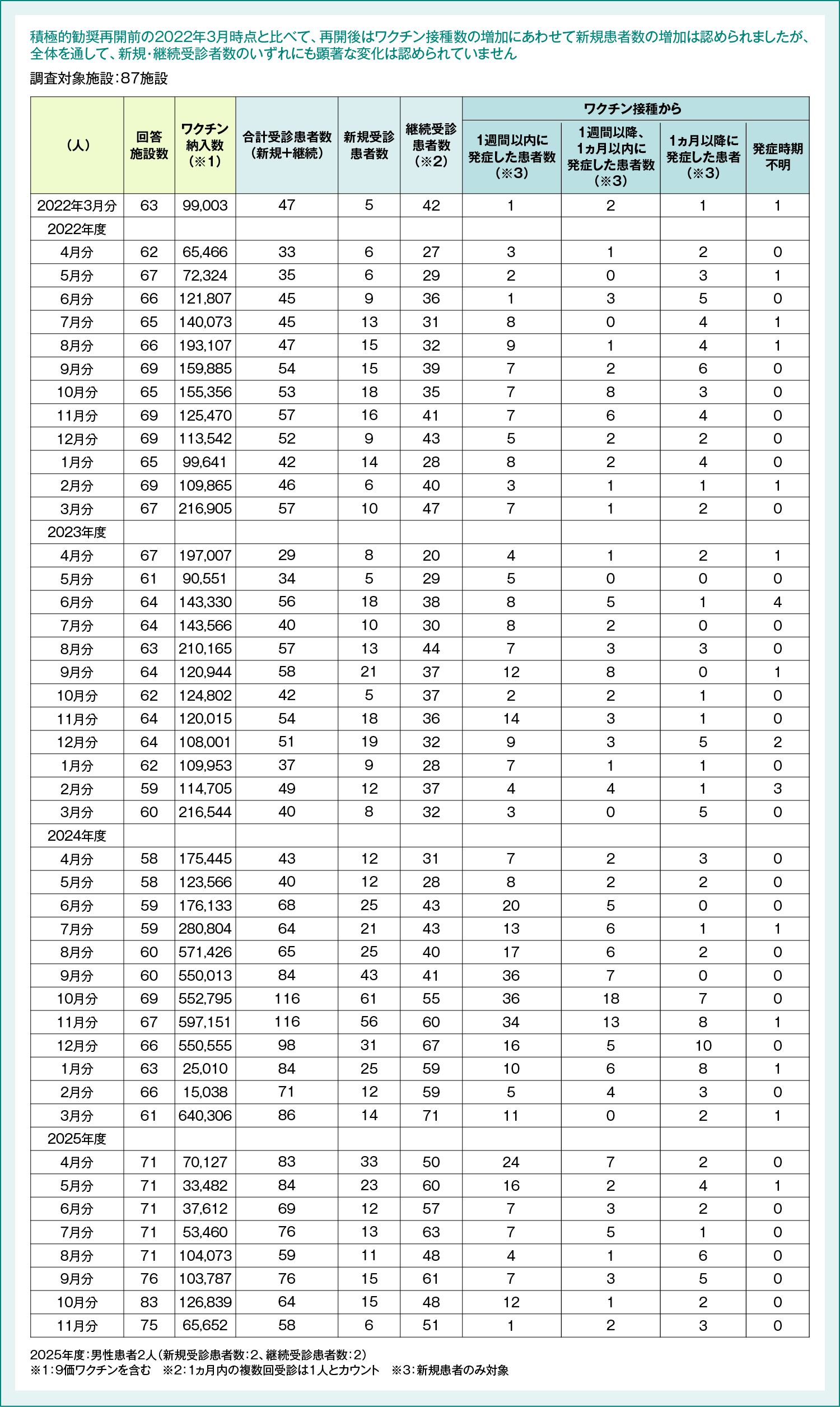 2026年2月の合同部会において、接種後に症状を呈した方の診療実態について、全国の協力医療機関に対してWebアンケートによる診療実態調査を行い(表11)、頻回かつ長期的フォローにより、受療実態を迅速に把握するとともに、患者の臨床像を丁寧に解析した結果が報告されました(表12)。