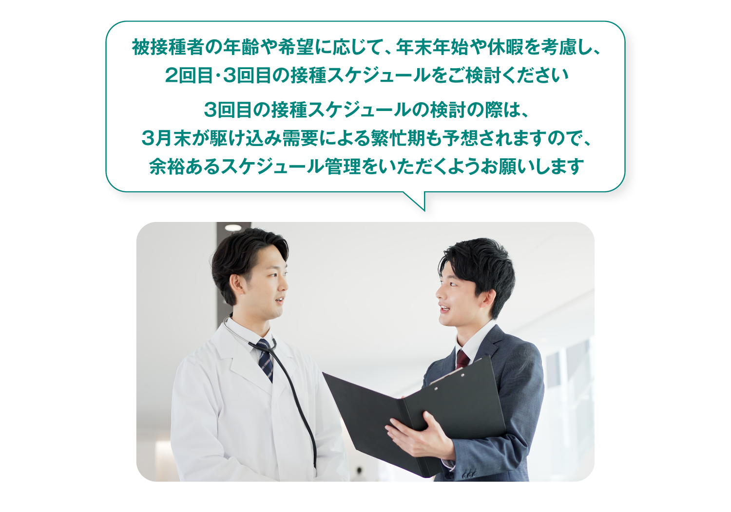 接種スケジュールの管理に関するメッセージと、医師に説明しているMRの写真