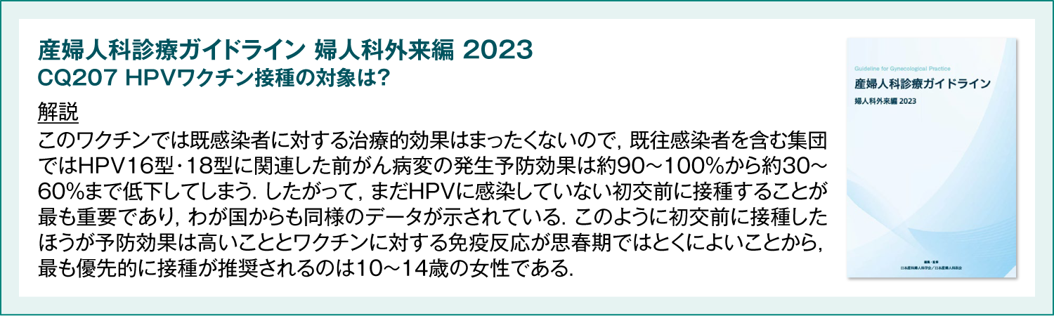 「産婦人科診療ガイドライン 婦人科外来編 2023」では、HPVワクチンは「まだHPVに感染していない初交前に接種することが重要である」とされているため、若年でのHPVワクチン接種が推奨されます。