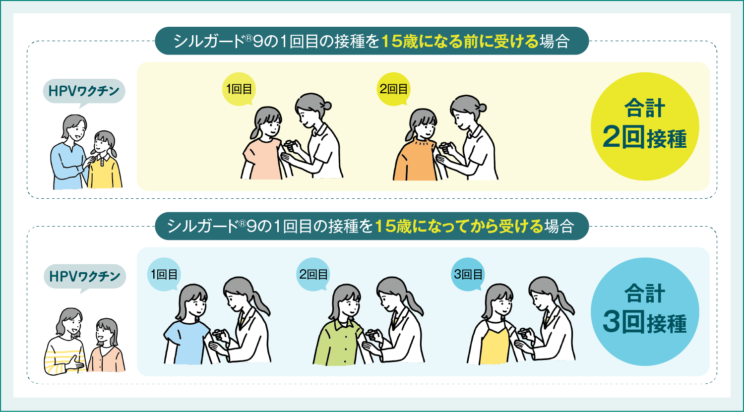 HPVワクチンの定期接種対象は小学校6年生から高校1年生相当の女子で、特に11〜15歳未満でシルガード®9の1回目の接種を受ける場合は、合計2回の接種で完了できます。