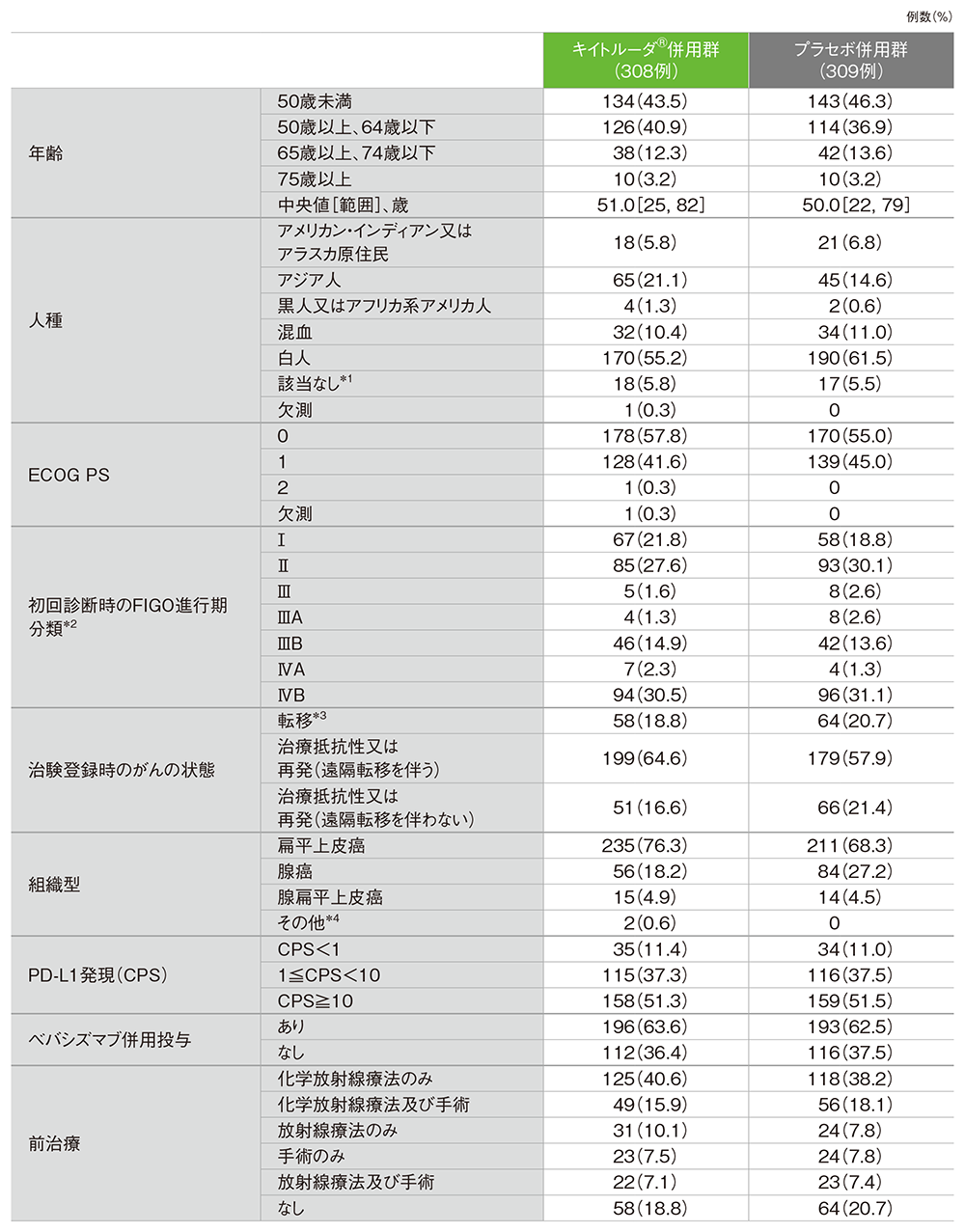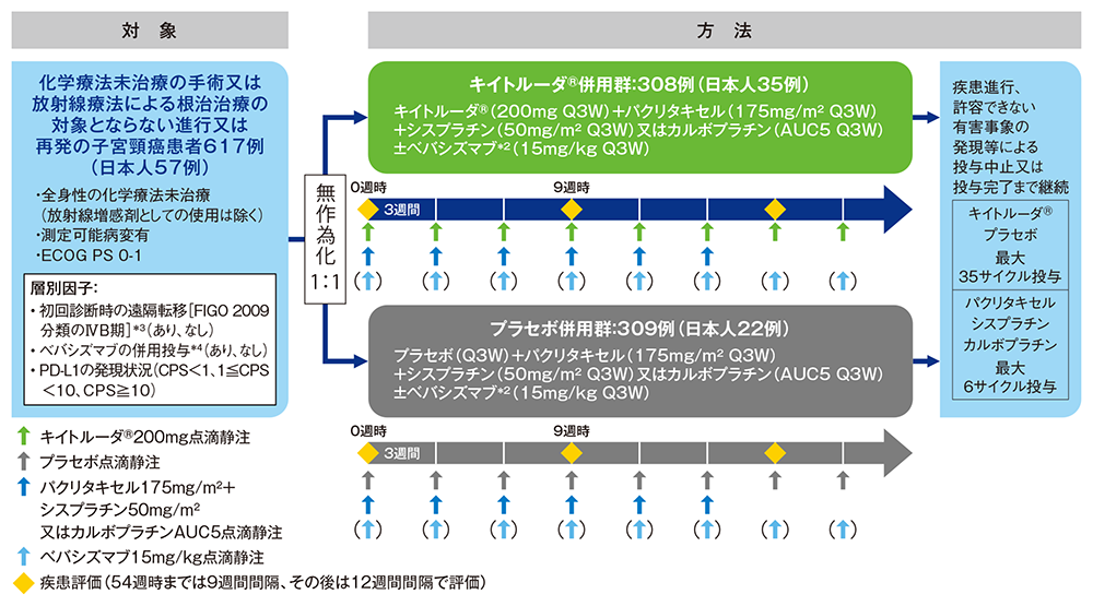 キイトルーダ®と化学療法±ベバシズマブ併用群(以下、キイトルーダ®併用群:キイトルーダ®200mg+パクリタキセル175mg/m2+シスプラチン50mg/m2又はカルボプラチンAUC5に相当する量±ベバシズマブ15mg/kgを3週間間隔(Q3W)で点滴静注)又はプラセボと化学療法±ベバシズマブ併用群(以下、プラセボ併用群:プラセボ+パクリタキセル175mg/m2+シスプラチン50mg/m2又はカルボプラチンAUC5に相当する量±ベバシズマブ15mg/kgをQ3Wで点滴静注)に1:1の割合で無作為に割り付けた。画像診断を無作為割り付けから54週時までは9週間間隔、その後は12週間間隔で実施又は臨床的に必要な場合はより頻回に行い、疾患進行、許容できない有害事象の発現等による投与中止又は投与完了まで継続した(キイトルーダ®及びプラセボ投与は最大35サイクル、パクリタキセル及びシスプラチン、カルボプラチン投与は最大6サイクル)*1。