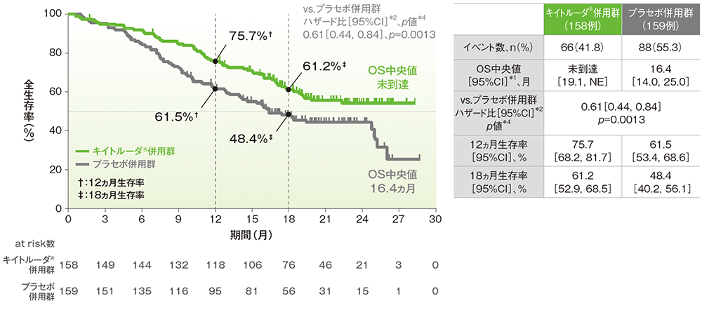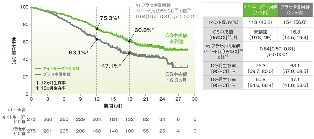 - OS中央値はキイトルーダ®併用群で19.0ヵ月(95%CI: 12.6, 21.4)、プラセボ併用群で18.9ヵ月(95%CI: 11.7, 21.3)でした*2。