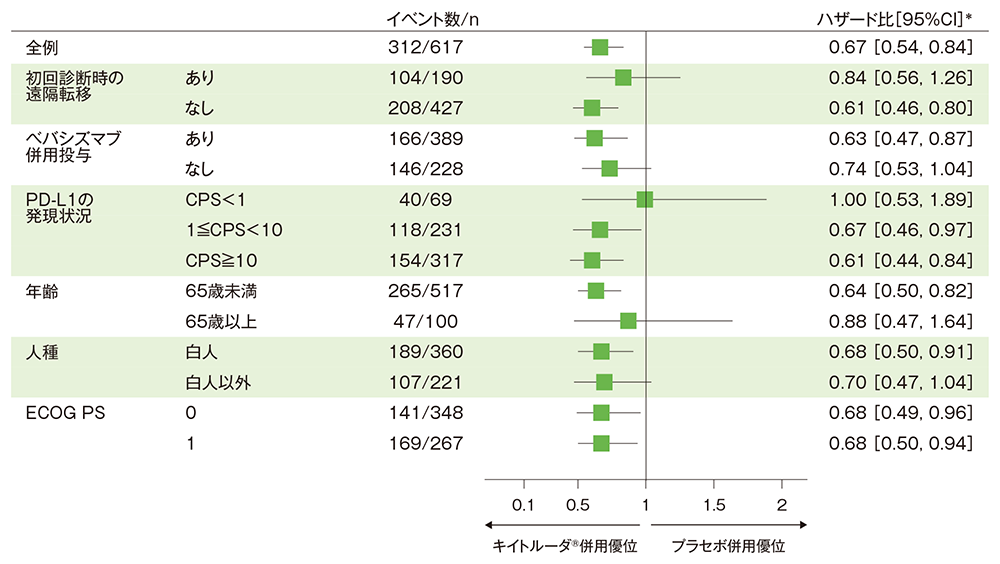 * 投与群を共変量とし、無作為化に用いた層別因子[初回診断時の遠隔転移(あり、なし)、ベバシズマブの併用投与(あり、なし)、PD-L1の発現状況(CPS<1、1≦CPS<10、CPS≧10)]を層別因子とした層別Cox比例ハザードモデルに基づく