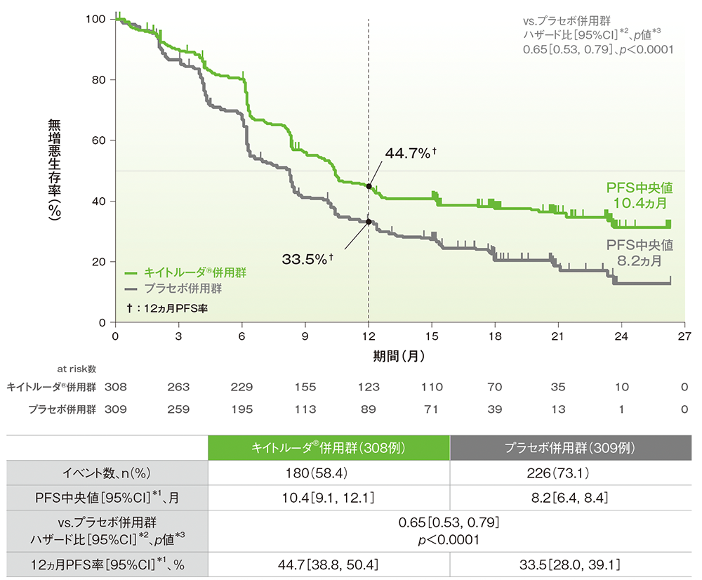 - 12ヵ月PFS率はキイトルーダ®併用群で44.6%(95%CI: 36.3, 52.5)、プラセボ併用群で33.5%(95%CI: 25.9, 41.2)でした。
