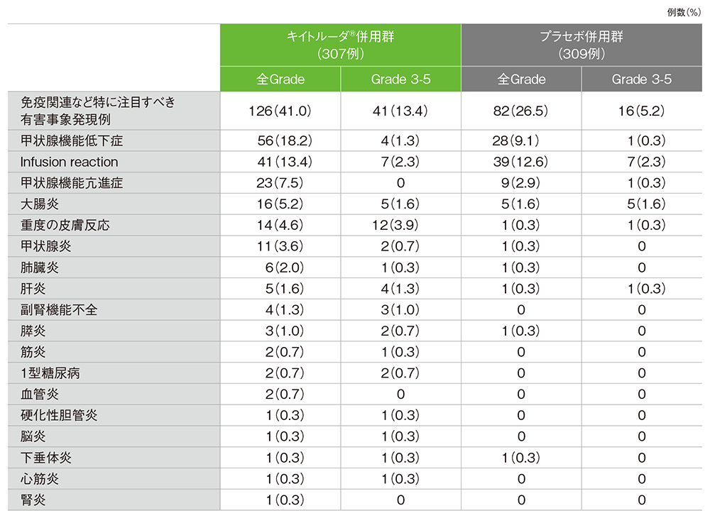 キイトルーダ®併用群では、副作用は298/307例(97.1%)に認められました。主な副作用(発現率20%以上)は、脱毛症171例(55.7%)、貧血149例(48.5%)、悪心104例(33.9%)、下痢76例(24.8%)、末梢性ニューロパチー75例(24.4%)、疲労70例(22.8%)、末梢性感覚ニューロパチー69例(22.5%)、好中球減少症68例(22.1%)、嘔吐63例(20.5%)でした。重篤な副作用は93例(30.3%)に認められ、2例以上にみられた重篤な副作用は、発熱性好中球減少症21例(6.8%)、貧血7例(2.3%)、女性生殖器瘻5例(1.6%)、下痢、急性腎障害 各4例(1.3%)、好中球減少症、血小板減少症、副腎機能不全、大腸炎、尿路感染 各3例(1.0%)、汎血球減少症、胃炎、腸管穿孔、直腸穿孔、嘔吐、免疫性肝炎、敗血症、注入に伴う反応、好中球数減少、末梢性運動ニューロパチー、月経中間期出血、腟出血、斑状丘疹状皮疹 各2例(0.7%)でした。いずれかの治験薬で投与中止に至った副作用は96例(31.3%)に認められ、2例以上にみられた投与中止に至った副作用は、貧血、末梢性ニューロパチー 各7例(2.3%)、急性腎障害、蛋白尿、女性生殖器瘻 各5例(1.6%)、過敏症、高血圧 各4例(1.3%)、好中球減少症、腸管穿孔、疲労、注入に伴う反応、血小板数減少、斑状丘疹状皮疹 各3例(1.0%)、血小板減少症、大腸炎、免疫性腸炎、悪心、直腸穿孔、免疫性肝炎、薬物過敏症、アスパラギン酸アミノトランスフェラーゼ増加、血中クレアチニン増加、錯感覚、末梢性運動ニューロパチー、腟瘻 各2例(0.7%)でした。死亡に至った副作用は2例(0.7%)に認められ、内訳は、腸管穿孔、自己免疫性脳炎 各1例(0.3%)でした。