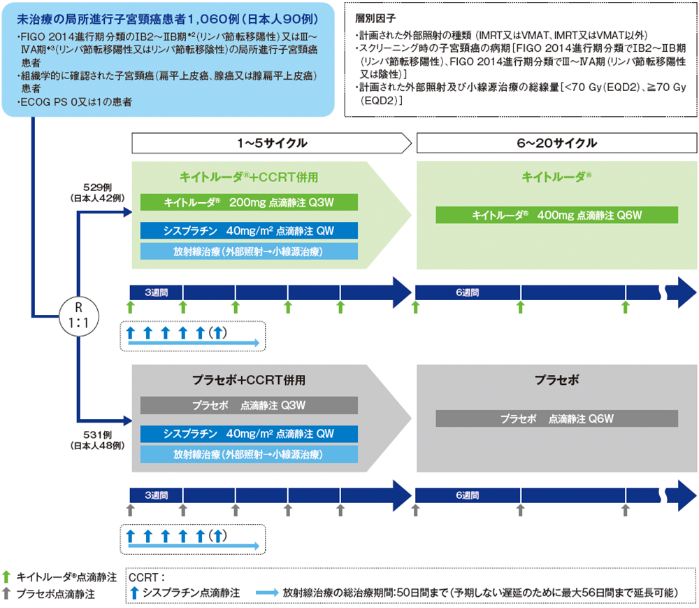 未治療*1の局所進行子宮頸癌患者におけるキイトルーダ®と同時化学放射線療法(CCRT:シスプラチン同時併用下での外部照射、及びその後の小線源治療)との併用群(以下、キイトルーダ®+CCRT群)と、プラセボとCCRTとの併用群(以下、プラセボ+CCRT群)の有効性及び安全性を比較検討する。