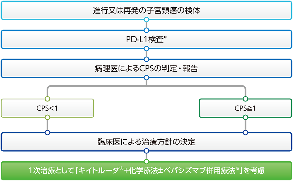 キイトルーダ®+化学療法±ベバシズマブ併用療法は、CPSにかかわらず使用可能ですが国際共同第Ⅲ相試験(KEYNOTE-826試験)で用いられたカットオフ値(CPS<1、CPS≧1)に基づいて治療方針が検討される場合があります。