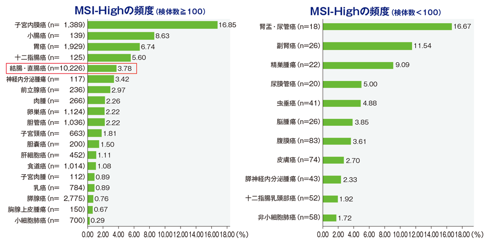 海外において32種類の癌患者12,019例を対象に解析し、24種類の癌においてMSI-High固形癌が示されました。割合が高い順は、子宮内膜癌、胃癌、小腸癌、結腸・直腸腺癌でした。