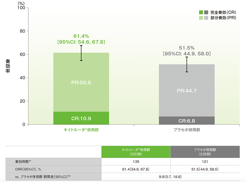 中間解析のデータカットオフ日は最後に患者が登録された日に近接しており、すべての患者がこの段階で無作為化されていなかったため、一部の患者では奏効評価のためのベースライン後の評価が得られていなかった。したがって、約9ヵ月の追加フォローアップを伴う事後解析が実施された。