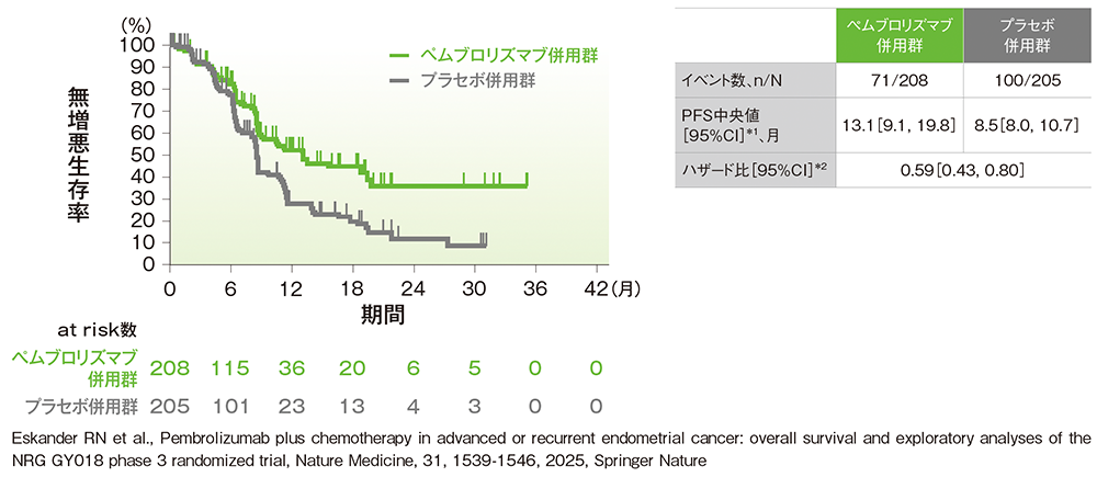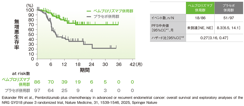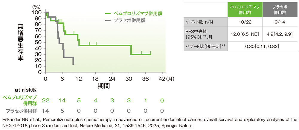 キイトルーダ®併用群では、プラセボ併用群と比較して、PFSの有意な延長が認められ(p<0.0001、層別ログランク検定[片側]、有意水準α=0.002074、検証的解析結果)、ハザード比は0.34(95%CI: 0.22, 0.53)でした。PFS中央値は、キイトルーダ®併用群で未到達(95%CI: 30.7, NE)、プラセボ併用群で8.3ヵ月(95%CI: 6.5, 12.3)でした。12ヵ月時点の無増悪生存率はキイトルーダ®併用群で73.0%(95%CI: 62.0, 81.3)、プラセボ併用群で40.0%(95%CI: 29.3, 50.4)でした。24ヵ月時点では、それぞれ65.2%(95%CI: 52.7, 75.2)、27.4%(95%CI: 15.2, 41.1)でした。