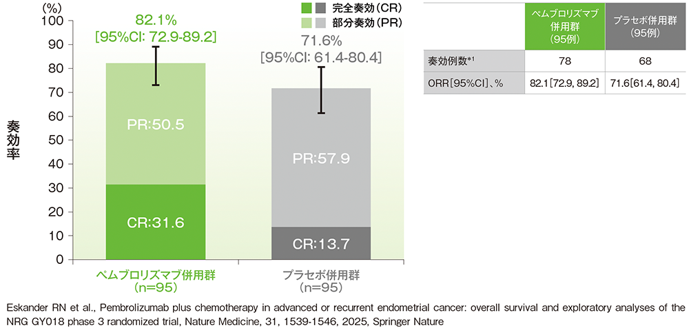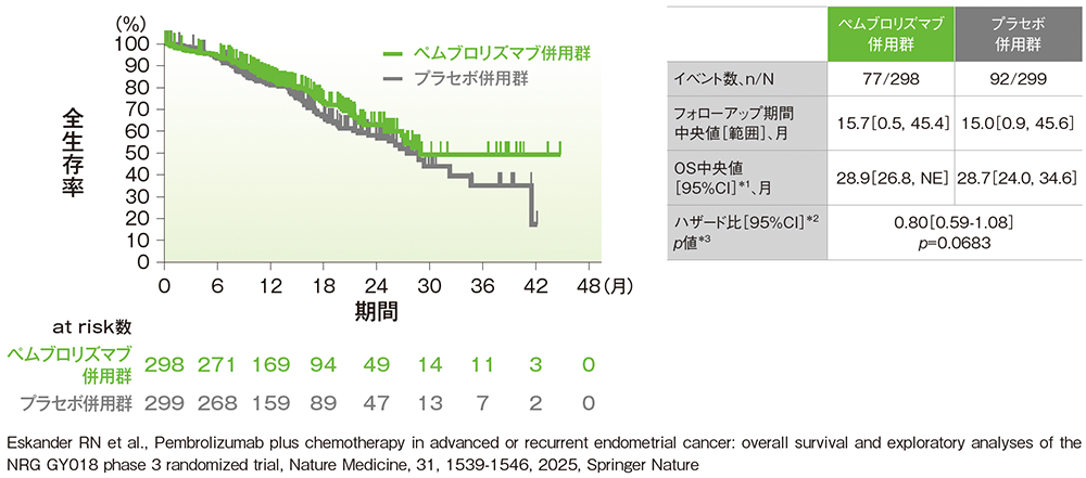 有効性評価の統計手法:PFSはKaplan-Meier法を用いて生存曲線を推定した。PFSの群間比較は層別ログランク検定を用いて評価し、投与群を共変量とした層別Cox比例ハザードモデルを用いて、ハザード比及びその95%信頼区間(CI)を算出した。層別ログランク検定及び層別Cox比例ハザードモデルの層別因子には術後補助化学療法の前治療歴(あり、なし)を用いた。OSは、中間解析時点では多重性を調整した正式な検定は計画していなかった。ORRの群間比較には層別Miettinen and Nurminen法を用いた。DORはKaplan-Meier法を用いて生存曲線を推定した。PFS及びOSについて、投与群を共変量としたCox比例ハザードモデルを用いて、PD-L1発現状況別(CPS≧1、CPS<1)の解析を実施した。PFS、OS、ORR、DOR、PD-L1発現状況(CPS≧1、CPS<1)別のPFS及びOSの解析はMMRステータスに基づき、pMMR又はdMMRの集団別に評価した。