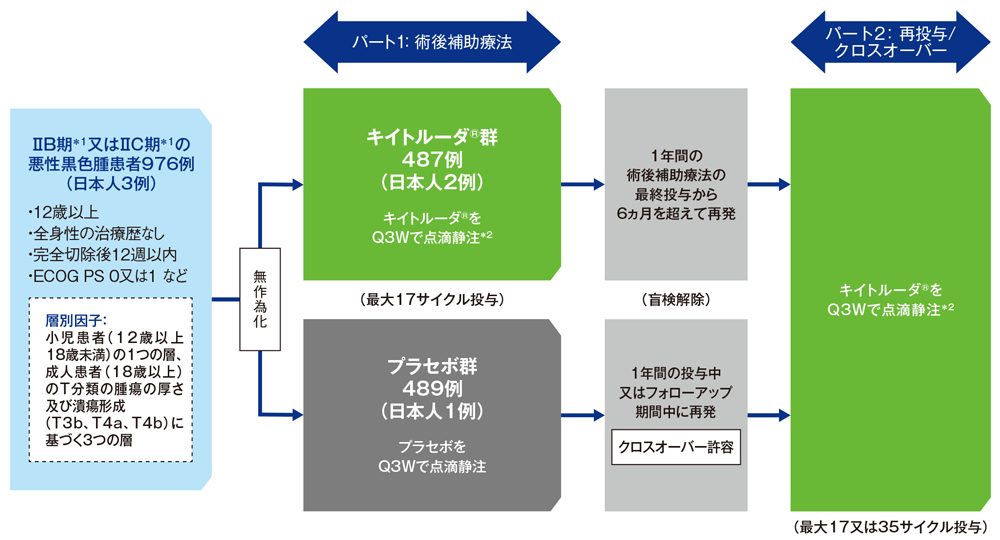 完全切除後のⅡB期*1又はⅡC期*1の悪性黒色腫患者における術後補助療法としてのキイトルーダ®の有効性及び安全性をプラセボと比較検討する。