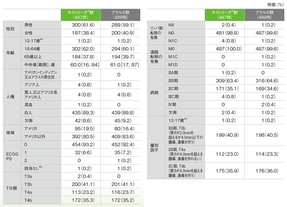 パート2:プラセボ群は疾患再発後にクロスオーバーを許容し、疾患進行又は再発まで最大17サイクル(局所/遠隔再発後に外科的切除した場合)又は35サイクル(切除不能である場合)のキイトルーダ®*2投与を可能とした。キイトルーダ®群は、最終投与から6ヵ月を超えて再発した場合、再投与として最大17サイクル(局所/遠隔再発後に外科的切除した場合)又は35サイクル(切除不能である場合)のキイトルーダ®*2投与を可能とした。投与中は画像診断を12週間毎に実施した。