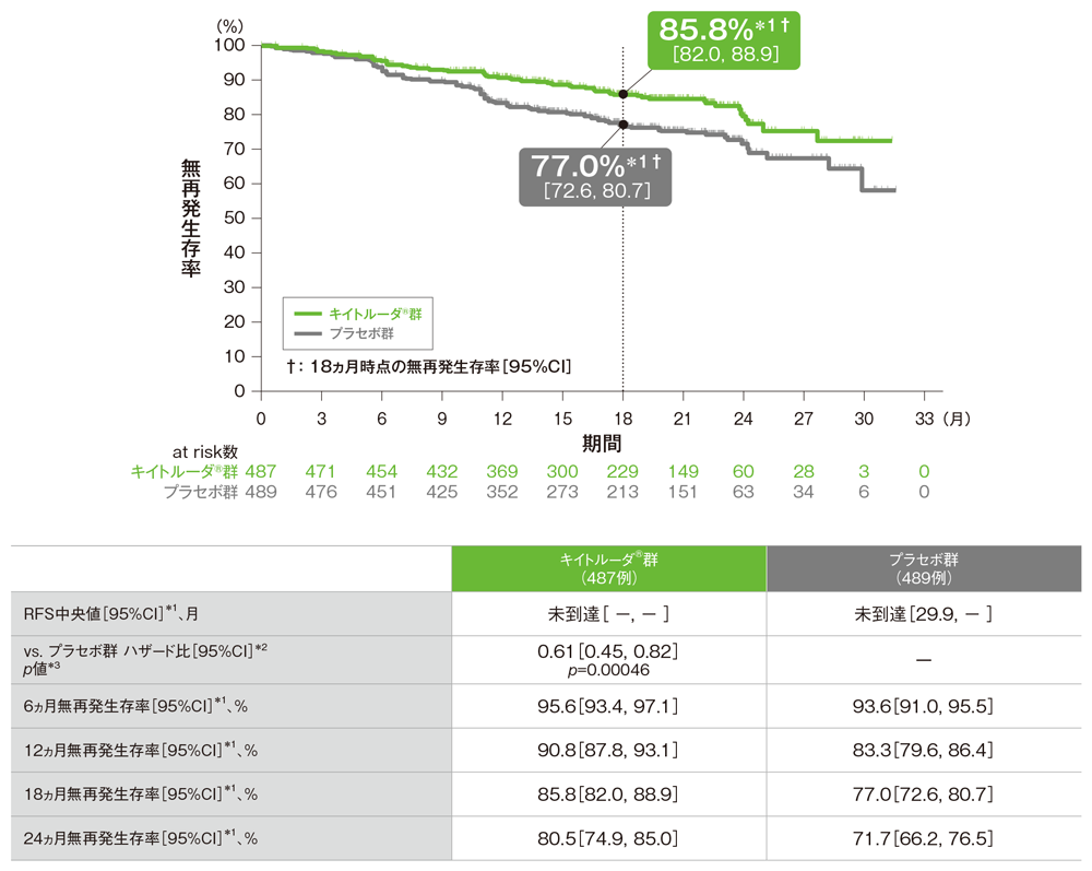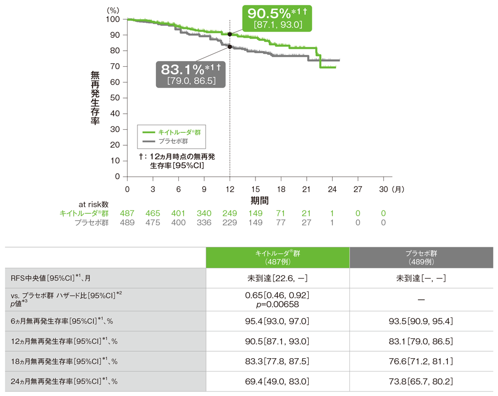 - RFS中央値は、キイトルーダ®群で未到達(95%CI: 22.6, -)、プラセボ群で未到達(95%CI: -, -)でした。