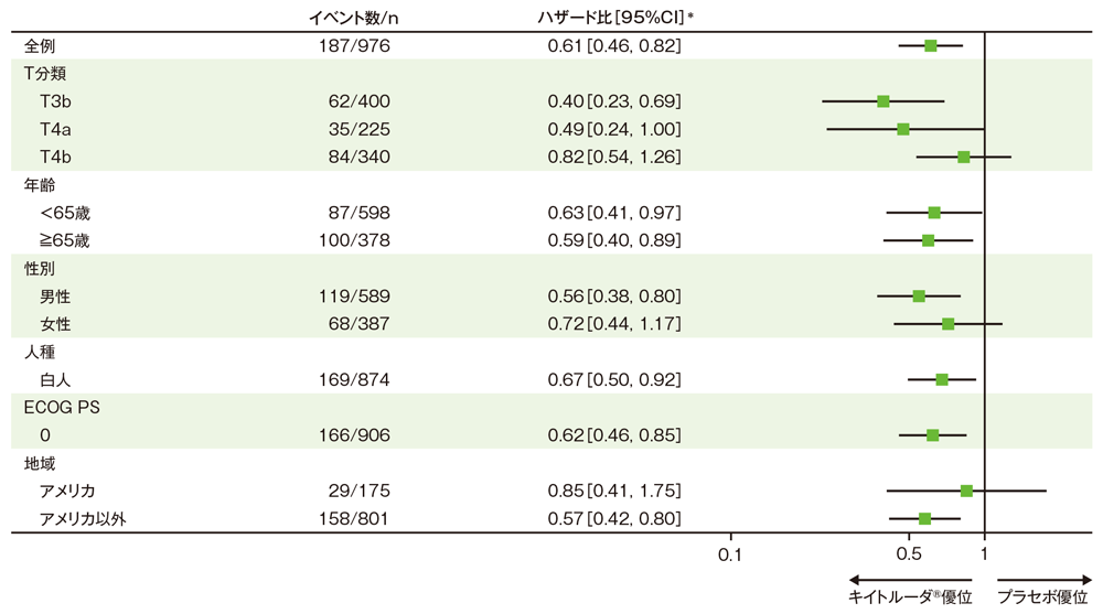 *3 名目上のp値。T分類の腫瘍の厚さ及び潰瘍形成(T3b、T4a、T4b)を層別因子とした層別ログランク検定[片側]