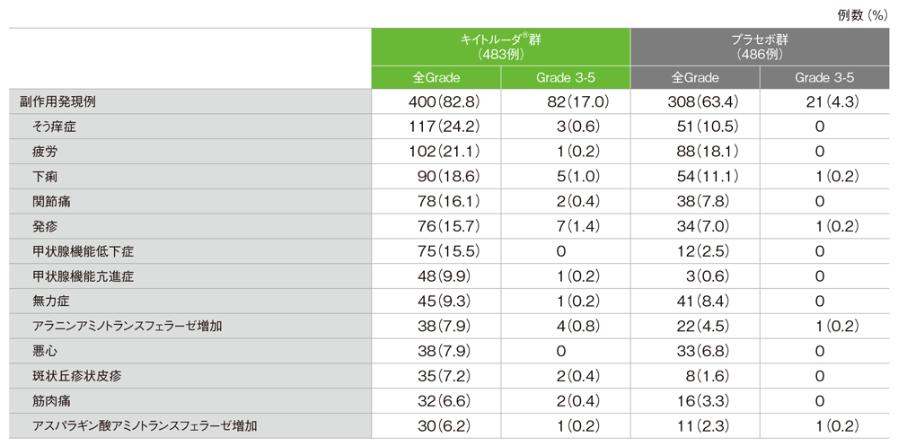 - 副作用は400/483例(82.8%)に認められ、主な副作用(発現率10%以上)はそう痒症117例(24.2%)、疲労102例(21.1%)、下痢90例(18.6%)、関節痛78例(16.1%)、発疹76例(15.7%)、甲状腺機能低下症75例(15.5%)でした。