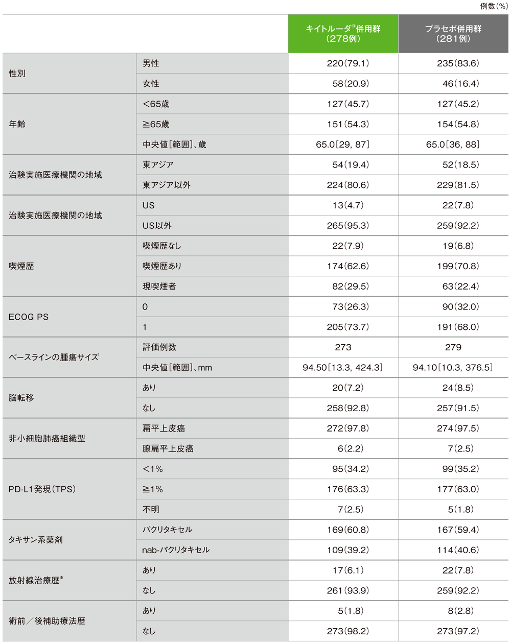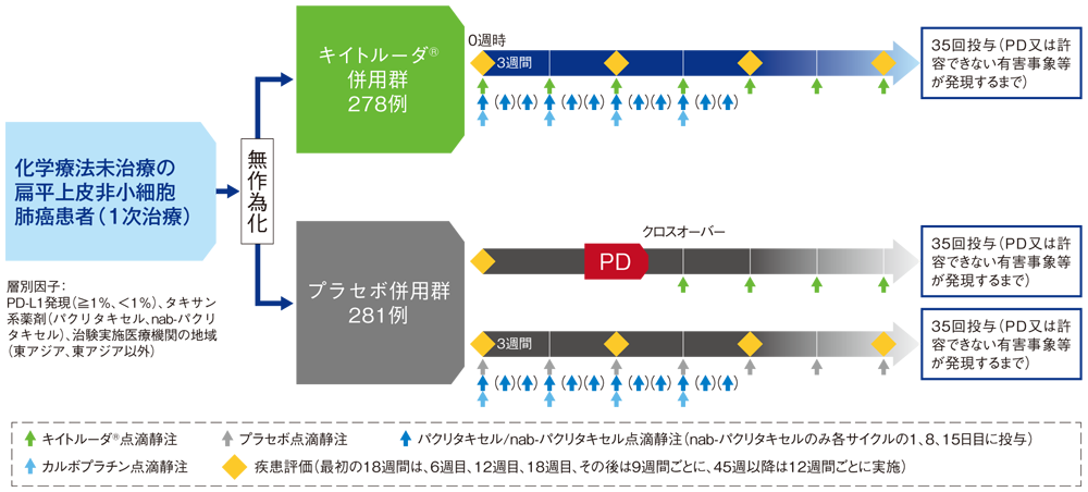 【目的】化学療法未治療の、進行・再発の扁平上皮非小細胞肺癌患者における、キイトルーダ®とパクリタキセル又はパクリタキセル(アルブミン懸濁型)(nab-パクリタキセル)及びカルボプラチン(以下、化学療法)併用と、プラセボと化学療法の併用の有効性及び安全性を比較検討する。