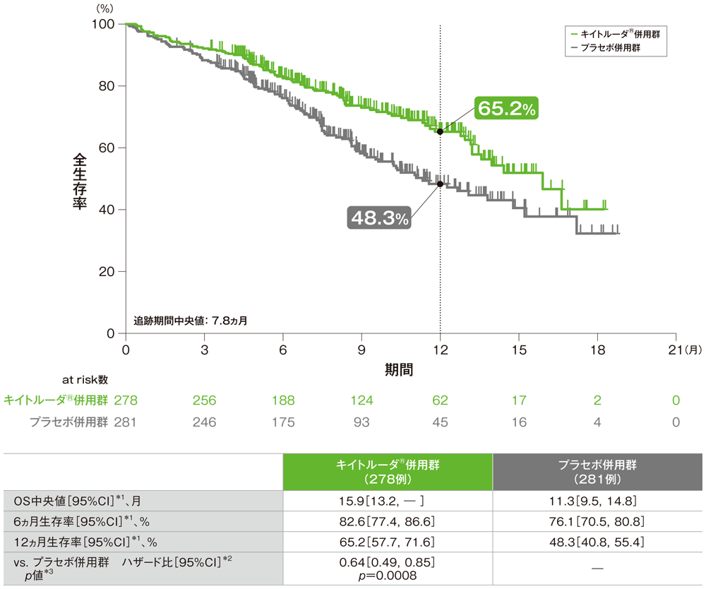 - OS中央値は、キイトルーダ®併用群15.9ヵ月(95%CI:13.2,未到達)、プラセボ併用群11.3ヵ月(95%CI:9.5,14.8)でした。プラセボ併用群に対するキイトルーダ®併用群のハザード比は0.64(95%CI:0.49,0.85)で、有意にOSを改善しました(p=0.0008、層別ログランク検定[片側]、有意水準α=0.0029;検証的解析結果)。