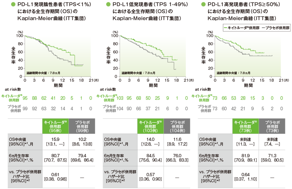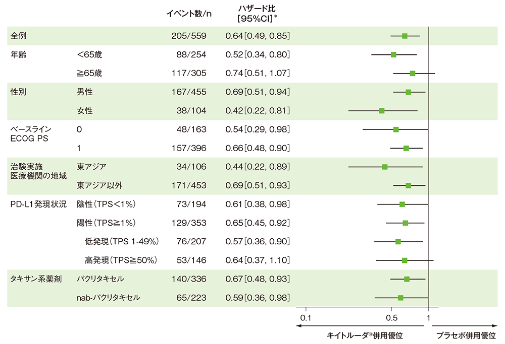 OSとPFSのサブグループ解析を層別因子であるPD-L1発現状況(≥1%、<1%)、タキサン系薬剤(パクリタキセル、nab-パクリタキセル)、治験実施医療機関の地域(東アジア、東アジア以外)*5の層別因子に加え、年齢(<65歳、≥65歳)、性別(男性、女性)、ECOG PS(0、1)、PD-L1発現状況(TPS<1%、TPS1-49%、TPS≥50%)などのベースライン時の背景因子別の部分集団を対象とし、層別Cox比例ハザードモデルを用いて実施した。 ORRのPD-L1発現状況[(TPS≥1%、TPS<1%)、 (TPS<1%、TPS1-49%、TPS≥50%)]のサブグループ解析には、Miettinen and Nurminen法を用いた。また、補足的にTwo-stageモデルを用いてクロスオーバーの影響を調整したOSの解析を行った。なお、日本人集団については、ITT集団と同じ統計手法を用いて解析したが、層での調整は行わなかった(データカットオフ日:2018年4月3日)。