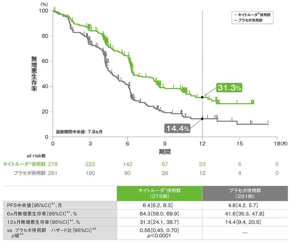 - プラセボ併用群において、後治療として抗PD-1/PD-L1抗体が投与された患者は89/281例(31.7%)でした。プラセボ併用群において、クロスオーバーとしてキイトルーダ®が投与された患者は75例(26.7%)、クロスオーバーの基準に合致しない後治療としてキイトルーダ®が投与された患者は2例(0.7%)、後治療としてニボルマブが投与された患者は10例(3.6%)、アテゾリズマブが投与された患者は2例(0.7%)でした。