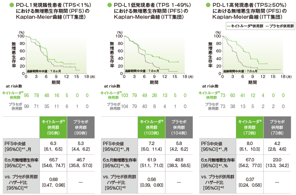 - プラセボ併用群に対するキイトルーダ®併用群のハザード比はPD-L1発現陰性患者(TPS<1%)で0.61(95%CI:0.38,0.98)、低発現患者(TPS 1-49%)で0.57(95%CI:0.36,0.90)、高発現患者(TPS≥50%)で0.64(95%CI:0.37,1.10)でした。