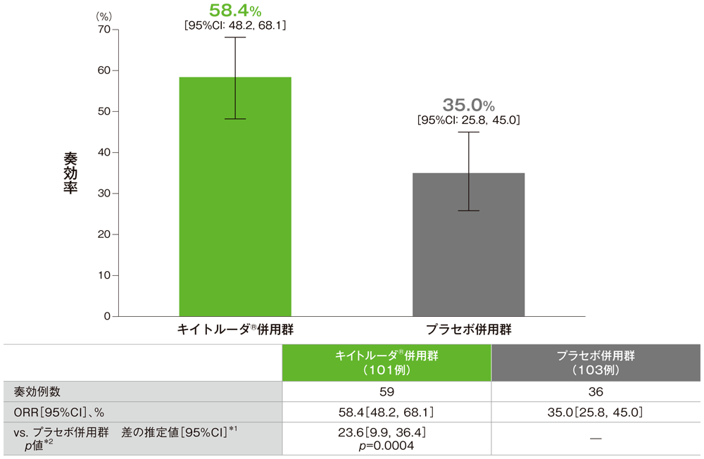 - ORRは、キイトルーダ®併用群58.4%(95%CI:48.2,68.1)、プラセボ併用群35.0%(95%CI:25.8,45.0)であり、プラセボ併用群に対してキイトルーダ®併用群で有意にORRが改善しました(p=0.0004、層別Miettinen and Nurminen法[片側]、有意水準α=0.005;検証的解析結果)