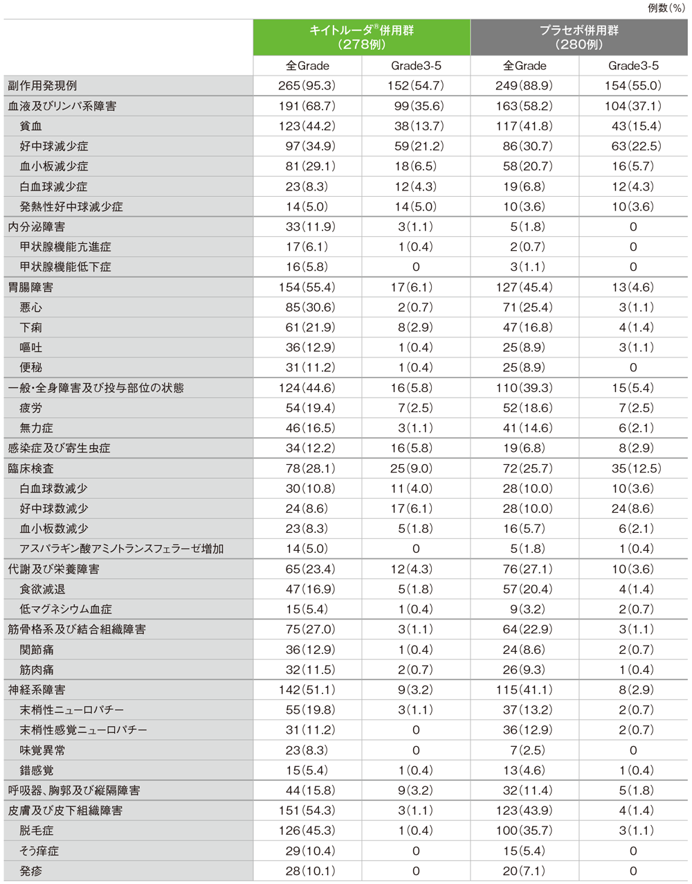 プラセボ併用群で副作用は249/280例(88.9%)に認められました。主な副作用(発現率10%以上)は、貧血117例(41.8%)、脱毛症100例(35.7%)、好中球減少症86例(30.7%)、悪心71例(25.4%)、血小板減少症58例(20.7%)、食欲減退57例(20.4%)、疲労52例(18.6%)、下痢47例(16.8%)、無力症41例(14.6%)、末梢性ニューロパチー37例(13.2%)、末梢性感覚ニューロパチー36例(12.9%)、好中球数減少、白血球数減少各28例(10.0%)でした。重篤な副作用は51例(18.2%)に認められ、2例以上にみられた重篤な副作用は、発熱性好中球減少症9例(3.2%)、好中球減少症7例(2.5%)、貧血5例(1.8%)、下痢、無力症各4例(1.4%)、肺炎、血小板減少症、急性腎障害、疲労各3例(1.1%)、間質性肺疾患、低血圧、敗血症性ショック各2例(0.7%)でした。副作用によるプラセボの中止は9例(3.2%)で、2例以上にみられたプラセボの中止に至った副作用は敗血症性ショック2例(0.7%)でした。副作用による化学療法の中止は20例(7.1%)で、2例以上にみられた化学療法の中止に至った副作用は好中球減少症3例(1.1%)、急性腎障害、敗血症性ショック、血小板減少症各2例(0.7%)でした。副作用による死亡は6例(2.1%)で、その内訳は敗血症性ショック2例(0.7%)、多臓器機能不全症候群、急性腎障害、肺炎、肺出血各1例(0.4%)でした。