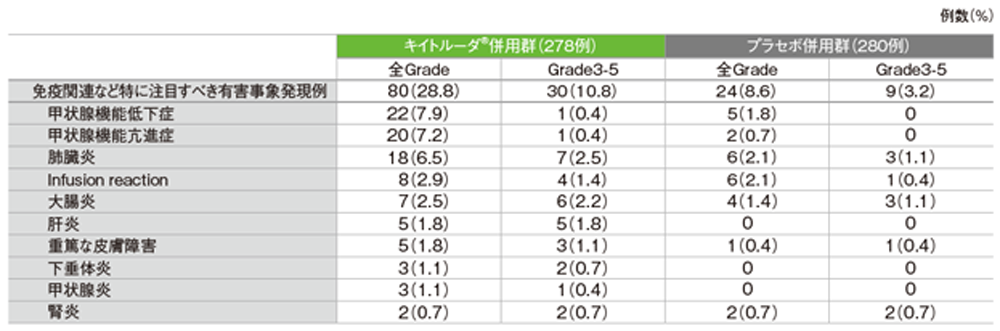 プラセボ併用群で注目すべき有害事象は24/280例(8.6%)に認められました。重篤な注目すべき有害事象は9例(3.2%)、起因する中止例は5例(1.8%)、死亡例は肺臓炎による1例(0.4%)でした。