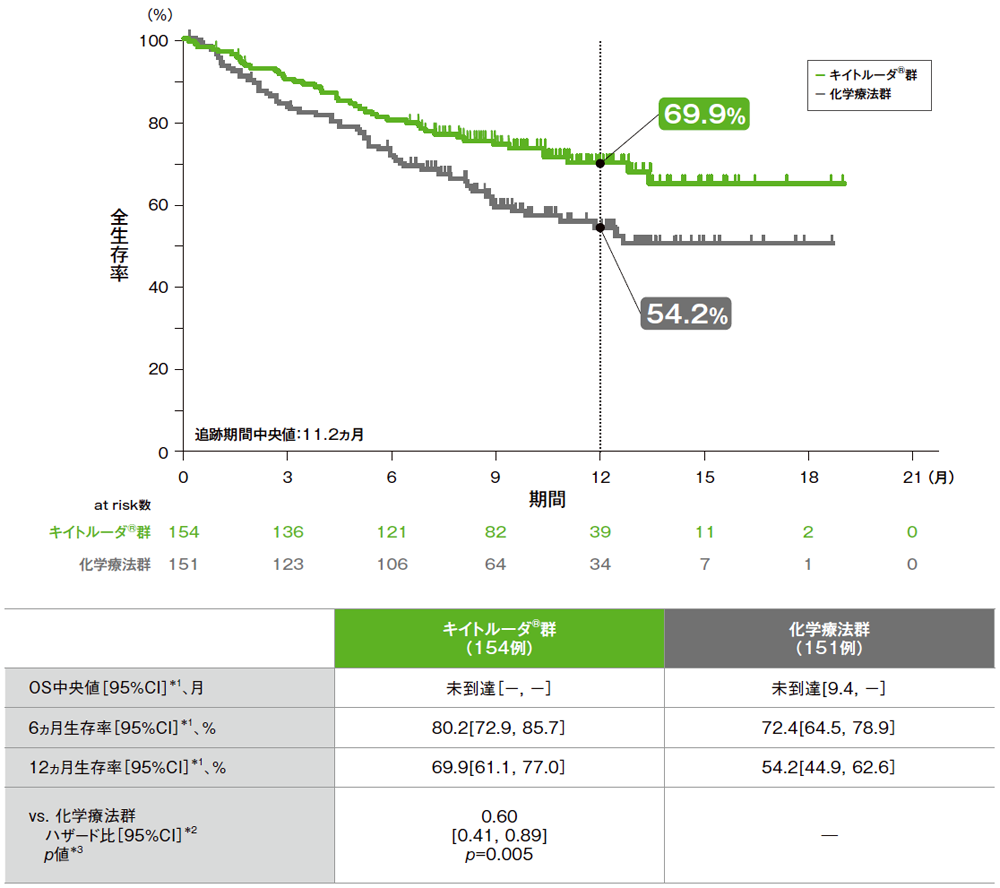- OS中央値は、キイトルーダ®群が未到達(95%CI:未到達,未到達)、化学療法群も未到達(95%CI:9.4,未到達)でした。化学療法群に対するキイトルーダ®群のハザード比は0.60(95%CI:0.41,0.89)で、有意にOSを改善しました(p=0.005、層別ログランク検定[片側]、有意水準α=0.0118;検証的解析結果)。なお、データカットオフ時点で、化学療法群の患者の43.7%(66例)がPD後にクロスオーバーを行いました。