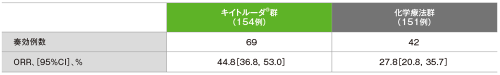 - キイトルーダ®群のORRは44.8%(95%CI:36.8,53.0)、化学療法群では27.8%(95%CI:20.8,35.7)でした。