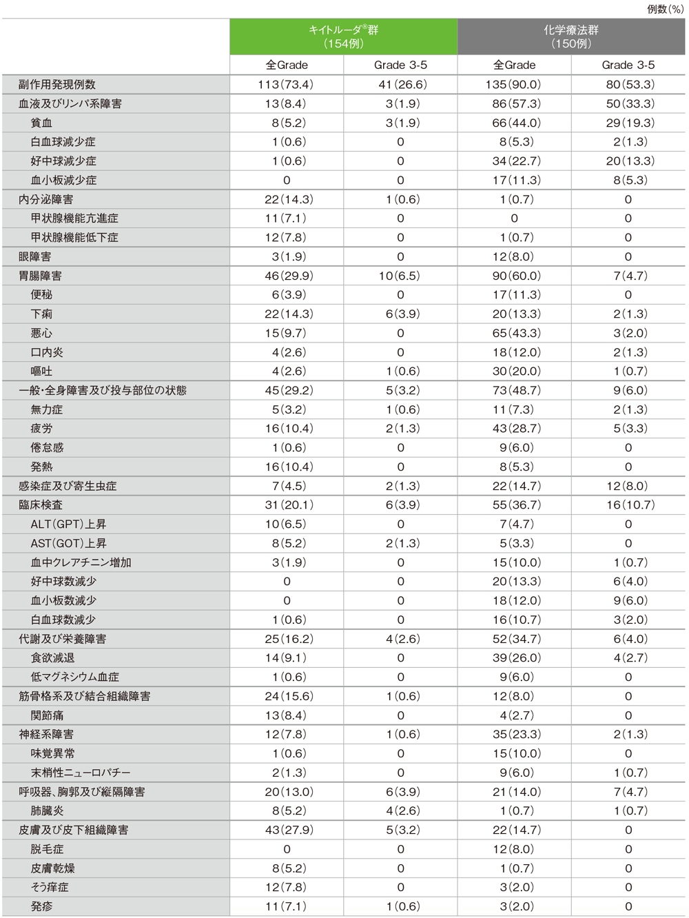 化学療法群で注目すべき有害事象は7/150例(4.7%)に認められました。重篤な注目すべき有害事象、起因する中止例、死亡例は認められませんでした。