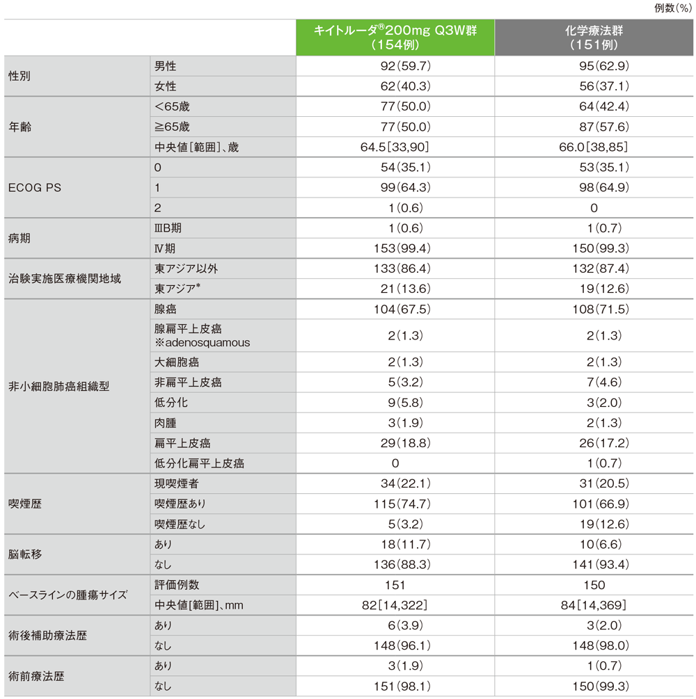 *5 無作為化層別因子:ECOG PS(0、1)、非小細胞肺癌組織型(扁平上皮癌、非扁平上皮癌)、治験実施医療機関の地域(東アジア、東アジア以外)