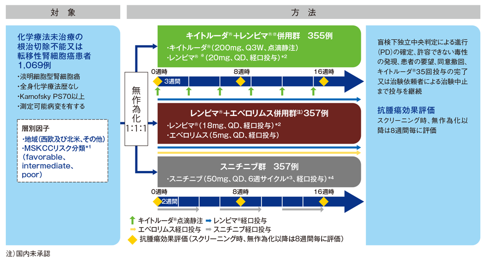 キイトルーダ®+レンビマ®※併用群[キイトルーダ®200mgを3週間間隔(Q3W)で点滴静注とレンビマ®※20mgを1日1回(QD)で経口投与]、レンビマ®+エベロリムス併用群注)[レンビマ®18mgQDで経口投与とエベロリムス5mgQDで経口投与]又はスニチニブ群[50mgQDで4週間経口投与後、2週間休薬]に1:1:1の割合で無作為に割り付けた。無作為化後、盲検下独立中央判定を8週間毎に実施し、抗腫瘍効果を評価した。盲検下独立中央判定による進行(PD)の確定、許容できない毒性の発現、患者の要望、同意撤回、キイトルーダ®35回投与の完了又は治験依頼者による治験中止まで治験薬の投与を継続した。