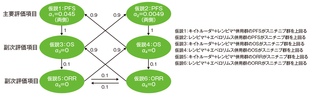 多重性の調整:本試験において、PFSは1回の中間解析及び最終解析、OSは3回の中間解析及び最終解析、ORRは1回の中間解析及び最終解析を事前に計画した。ORRの1回目の中間解析時の推定における両側0.0001の有意水準を差し引き、PFS、OS及びORRの検定の手順全体の有意水準を両側0.0499となるように厳密に制御した。これらの多重性の調整には、Maurer & Bretzのgraphical approachを用いた。他の副次及び探索的な評価項目に関しては多重性の調整は実施しない。最初に割り当てられた有意水準0.045(又は0.0049)にてPFSの帰無仮説が棄却された場合、この有意水準0.045(又は0.0049)に示される重みに従い、他の検定に再配分した。PFS、OSの中間解析及び最終解析の有意水準の配分はα消費関数にて決定した。