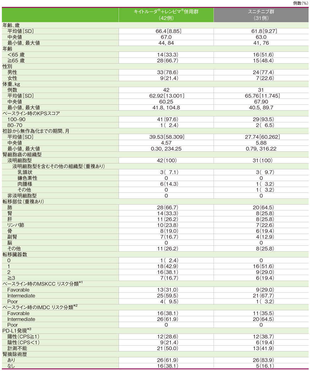 *2 IMDC(International Metastatic Renal Cell Carcinoma Database Consortium)リスク分類:6つのリスク因子[Karnofsky PS80未満、初診から治療開始までの期間(本試験の無作為化までの期間)が1年未満、ヘモグロビン値が正常範囲の下限未満、補正血清カルシウム値が正常範囲の上限超、好中球数が正常範囲の上限超、血小板数が正常範囲の上限超]で構成され、IMDCスコア0をfavorable、1-2をintermediate、3-6をpoorに分類