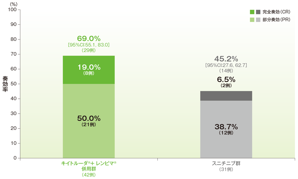 ORRはキイトルーダ®+レンビマ®併用群69.0%(95%CI:55.1, 83.0)、スニチニブ群45.2%(95%CI:27.6, 62.7)でした(群間差:23.9、95%CI:1.5, 46.3)。