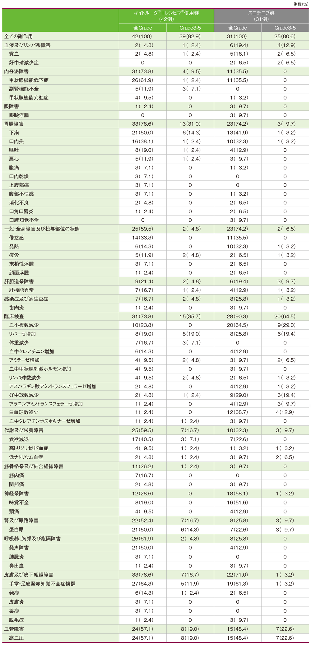 キイトルーダ®+レンビマ®併用群における副作用は42例全例(100%)に認められました。主な副作用(発現率20%以上)は手掌・足底発赤知覚不全症候群27例(64.3%)、甲状腺機能低下症26例(61.9%)、高血圧24例(57.1%)、下痢、蛋白尿及び発声障害 各21例(50.0%)、食欲減退17例(40.5%)、口内炎16例(38.1%)、倦怠感14例(33.3%)、血小板数減少10例(23.8%)でした。重篤な副作用は21例(50.0%)に認められ、2例以上にみられた重篤な副作用は副腎機能不全5例(11.9%)、食欲減退3例(7.1%)でした。副作用によるキイトルーダ®及びレンビマ®の投与中止は6例(14.3%)に認められ、その内訳は急性心不全、下痢、肝機能異常、膀胱炎、腎不全、肺障害、手掌・足底発赤知覚不全症候群 各1例(2.4%)でした。副作用によるキイトルーダ®の投与中止は10例(23.8%)に認められ、その内訳は急性心不全、下痢、免疫性膵炎、免疫性肝炎、肝機能異常、膀胱炎、ニューモシスチス・イロベチイ肺炎、腎不全、肺臓炎、肺障害、手掌・足底発赤知覚不全症候群 各1例(2.4%)でした。副作用によるレンビマ®の投与中止は12例(28.6%)に認められ、その内訳は心筋梗塞、急性心不全、下痢、肝機能異常、膀胱炎、心電図QT延長、リパーゼ増加、腎不全、肺障害、発疹、薬疹、多形紅斑、手掌・足底発赤知覚不全症候群 各1例(2.4%)でした。本試験の日本人集団において、キイトルーダ®+レンビマ®併用群の副作用による死亡は認められませんでした。