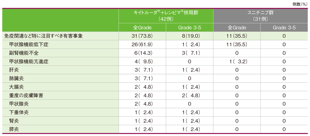 キイトルーダ®+レンビマ®併用群における免疫関連など特に注目すべき有害事象は31/42例(73.8%)に認められました。主な免疫関連など特に注目すべき有害事象(発現率10%以上)は甲状腺機能低下症26例(61.9%)、副腎機能不全6例(14.3%)でした。重篤な免疫関連など特に注目すべき有害事象は10例(23.8%)に認められ、2例以上にみられた重篤な免疫関連など特に注目すべき有害事象は副腎機能不全5例(11.9%)、肝炎2例(4.8%)でした。免疫関連など特に注目すべき有害事象によるキイトルーダ®の投与中止は3例(7.1%)に認められ、キイトルーダ®の投与中止に至った免疫関連など特に注目すべき有害事象は肝炎、膵炎及び肺臓炎 各1例(2.4%)でした。本試験の日本人集団において、免疫関連など特に注目すべき有害事象による死亡は認められませんでした。